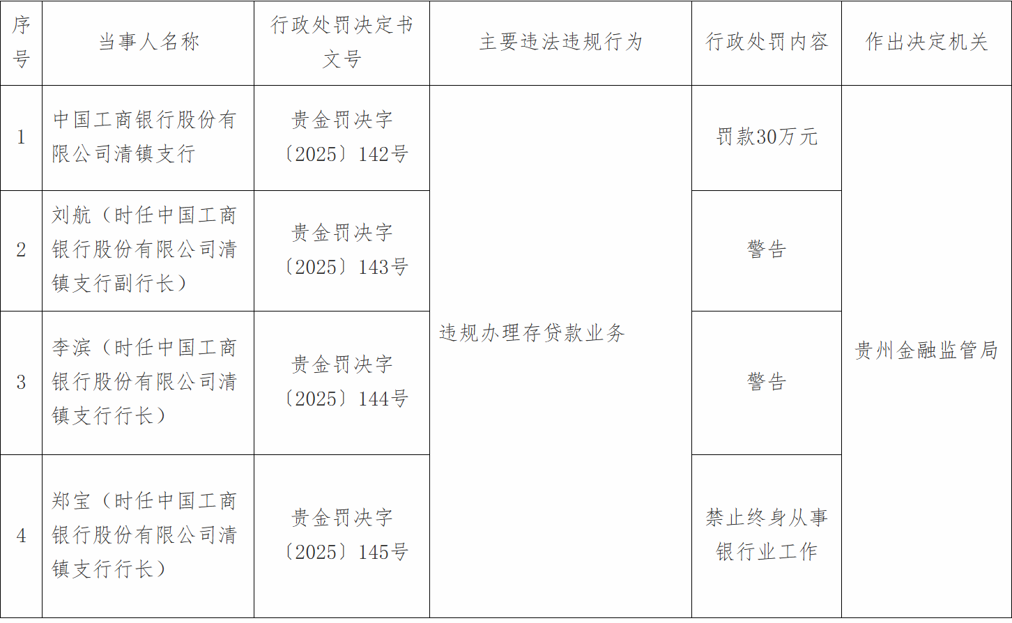 1月8日,国家金融监督管理总局贵州监管局行政处罚信息公开表显示,中国工商银行股份有限公司清镇支行因违规办理存贷款业务被罚款30万元;责任人刘某、李某被警告;郑某被终身禁业。